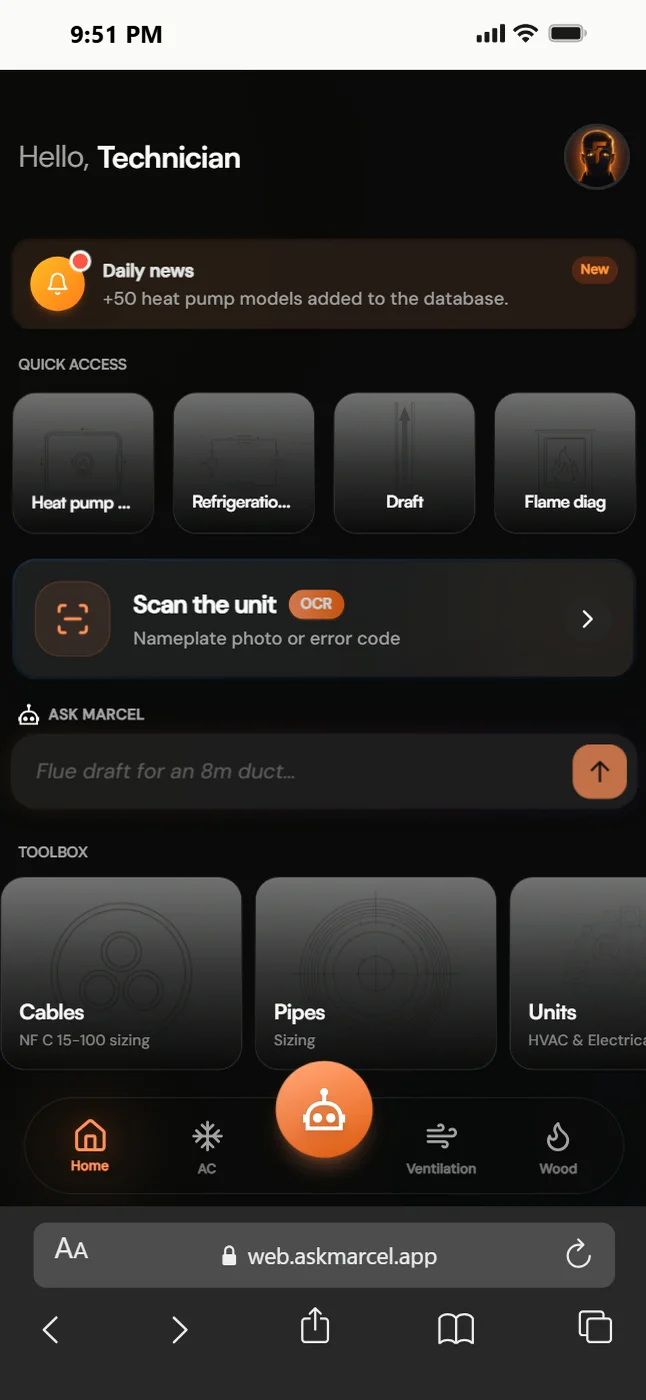 PAC Daikin, poêle Palazzetti, chaudière Viessmann, clim Mitsubishi — Marcel a été entraîné sur les docs constructeurs. Pas sur Wikipedia.
